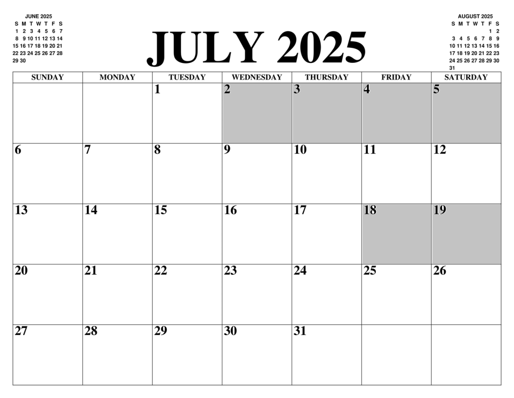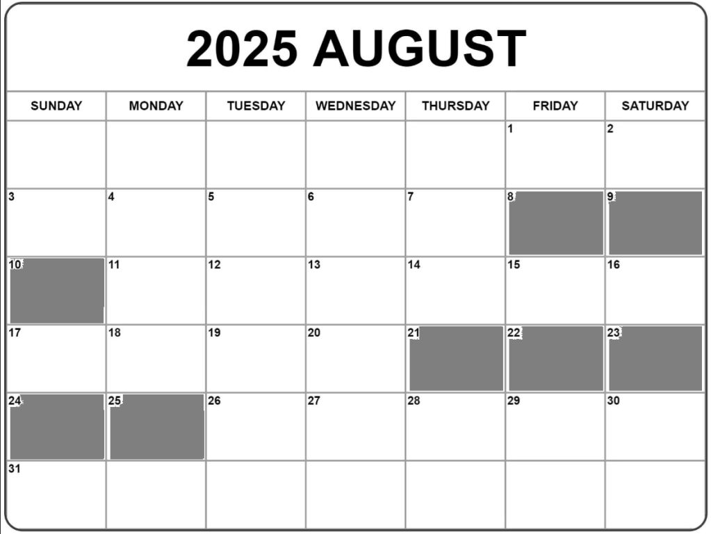 Current summer 2025 available dates are in white (grey = unavailable):